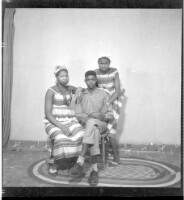 Three people sitting and standing on a mat: two women wearing matching camisoles, pagnes, head wraps, and necklaces, one sitting on a chair and the other standing with her left arm on a man wearing a grey shirt, grey pants, and black shoes sitting in betw