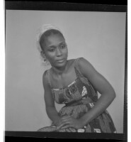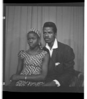 A young woman wearing a camisole, head wrap, earrings, necklace, and a bracelet sitting with a man wearing a white shirt, black suit, and a watch, both face-forward in the studio.