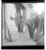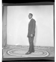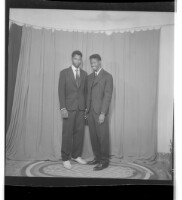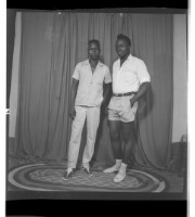 Two men, one wearing a shirt and pants standing face-forward and the other wearing a shirt and shorts standing in profile with his hand in his pocket in the studio.
