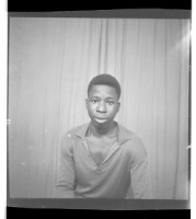 A family photo of 5 people: a little boy on the far right wearing a white short-sleeved t-shirt and shirts with some cotton on his right leg standing, next to a woman wearing a dress and head wrap with a baby sitting, a woman to her left wearing a black a
