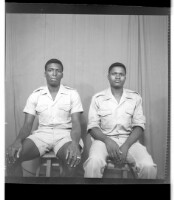 191. EAP449/2/28/191 Reference (shelfmark): EAP449/2/28/191 Title: Two men, one wearing a shirt and pants and the other wearing a shirt and shorts sitting face-forward in the studio. Collection Area: Endangered Archives Programme Languages: Not applicable Date Range: 2nd half od the 20th century Extent: 1 TIFF image