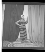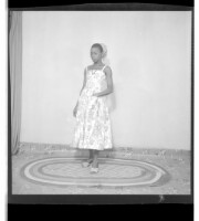 197. EAP449/2/28/197 Reference (shelfmark): EAP449/2/28/197 Title: A woman wearing a dress with her hand in her pocket standing in profile in the studio. Collection Area: Endangered Archives Programme Languages: Not applicable Date Range: 2nd half od the 20th century Extent: 1 TIFF image