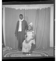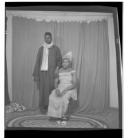200. EAP449/2/28/200 Reference (shelfmark): EAP449/2/28/200 Title: A man wearing a boubou standing face-forward with a woman wearing a dress and head wrap sitting in profile in the studio. Collection Area: Endangered Archives Programme Languages: Not applicable Date Range: 2nd half od the 20th century Extent: 1 TIFF image