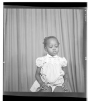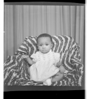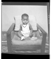 234. EAP449/2/28/234 Reference (shelfmark): EAP449/2/28/234 Title: A baby sitting face-forward on a pagne in a chair in the studio. Collection Area: Endangered Archives Programme Languages: Not applicable Date Range: 2nd half od the 20th century Extent: 1 TIFF image
