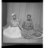 244. EAP449/2/28/244 Reference (shelfmark): EAP449/2/28/244 Title: Two women wearing dresses sitting, one face-forward and the other in profile, on a mat in the studio. Collection Area: Endangered Archives Programme Languages: Not applicable Date Range: 2nd half od the 20th century Extent: 1 TIFF image