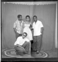 284. EAP449/2/28/284 Reference (shelfmark): EAP449/2/28/284 Title: A woman wearing a dress standing face-forward and three men wearing shirts and pants, the one wearing glasses sitting in profile and the other two standing, one face-forward and the other in profile in the studio. Collection Area: Endangered Archives Programme Languages: Not applicable Date Range: 2nd half od the 20th century Extent: 1 TIFF image