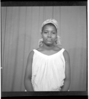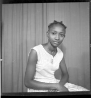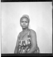 285. EAP449/2/28/285 Reference (shelfmark): EAP449/2/28/285 Title: A woman wearing a dress and head wrap sitting face-forward in the studio. Collection Area: Endangered Archives Programme Languages: Not applicable Date Range: 2nd half od the 20th century Extent: 1 TIFF image