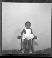 287. EAP449/2/28/287 Reference (shelfmark): EAP449/2/28/287 Title: A baby standing face-forward in front of a stool in the studio. Collection Area: Endangered Archives Programme Languages: Not applicable Date Range: 2nd half od the 20th century Extent: 1 TIFF image