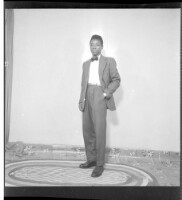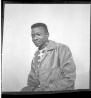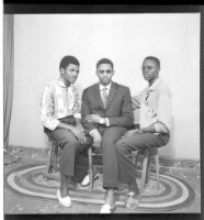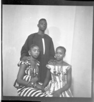 Two girls wearing dresses and necklaces sitting, one face-forward and the other in profile, and a man wearing a boubou standing in profile in the studio.