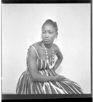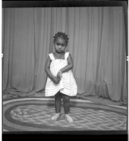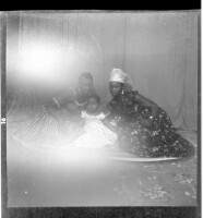 Two women wearing dresses and head wraps sitting in profile and a young girl wearing a dress sitting face-forward on a mat in the studio. The photo is poorly lighted.