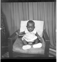 368. EAP449/2/28/368 Reference (shelfmark): EAP449/2/28/368 Title: A baby wearing a white dress sitting face-forward in a chair in the studio. Collection Area: Endangered Archives Programme Languages: Not applicable Date Range: 2nd half od the 20th century Extent: 1 TIFF image