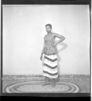 386. EAP449/2/28/386 Reference (shelfmark): EAP449/2/28/386 Title: A girl wearing a dress and pagne standing in profile in the studio. Collection Area: Endangered Archives Programme Languages: Not applicable Date Range: 2nd half od the 20th century Extent: 1 TIFF image