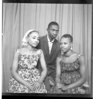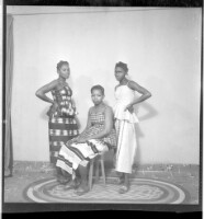 388. EAP449/2/28/388 Reference (shelfmark): EAP449/2/28/388 Title: Three girls wearing dresses and pagnes, two standing in profile and one sitting in profile in the studio. Collection Area: Endangered Archives Programme Languages: Not applicable Date Range: 2nd half od the 20th century Extent: 1 TIFF image