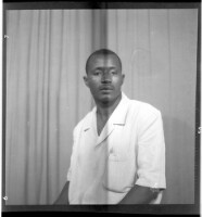 387. EAP449/2/28/387 Reference (shelfmark): EAP449/2/28/387 Title: A man wearing a shirt and pants standing in profile and a woman wearing a pagne and head wrap sitting in profile in the studio. Collection Area: Endangered Archives Programme Languages: Not applicable Date Range: 2nd half od the 20th century Extent: 1 TIFF image
