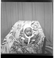 394. EAP449/2/28/394 Reference (shelfmark): EAP449/2/28/394 Title: A baby sitting face-forward on a blanket in a chair in the studio. Collection Area: Endangered Archives Programme Languages: Not applicable Date Range: 2nd half od the 20th century Extent: 1 TIFF image