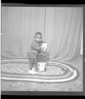 395. EAP449/2/28/395 Reference (shelfmark): EAP449/2/28/395 Title: A child standing face-forward leaning on a box in the studio. Collection Area: Endangered Archives Programme Languages: Not applicable Date Range: 2nd half od the 20th century Extent: 1 TIFF image