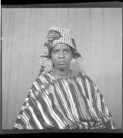 411. EAP449/2/28/411 Reference (shelfmark): EAP449/2/28/411 Title: A woman wearing a pagne and head wrap sitting face-forward in the studio. Collection Area: Endangered Archives Programme Languages: Not applicable Date Range: 2nd half od the 20th century Extent: 1 TIFF image
