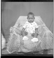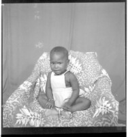 416. EAP449/2/28/416 Reference (shelfmark): EAP449/2/28/416 Title: A baby sitting face-forward on a cloth in a chair in the studio. Collection Area: Endangered Archives Programme Languages: Not applicable Date Range: 2nd half od the 20th century Extent: 1 TIFF image