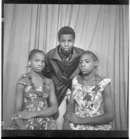 417. EAP449/2/28/417 Reference (shelfmark): EAP449/2/28/417 Title: Three people: two girls wearing dresses sitting in profile and a man wearing a shirt standing face-forward in between them in the studio. Collection Area: Endangered Archives Programme Languages: Not applicable Date Range: 2nd half od the 20th century Extent: 1 TIFF image