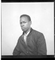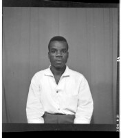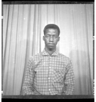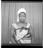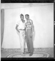 A girl in a dress and hat, the hand of a man under her arm, the man wearing a shirt and pants, both standing in profile on a stage in front of several people behind a well decorated background.