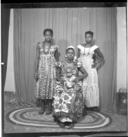 A woman wearing a dress and head wrap sitting face-forward holding a baby on her lap in front of two girls wearing dresses and necklaces standing face-forward in the studio.