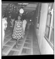 A man in a dress shirt, jacket, and pants, standing in profile holding the neck of a girl facing forward in a dress in the hallway of a house in front of several other people.