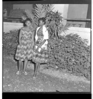 Two girls in dresses, one wearing a headscarf holding a wallet in her hands, both standing, one facing forward and the other in profile in front of flowers and a mango tree.