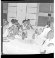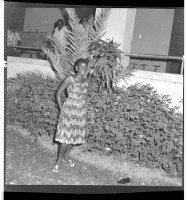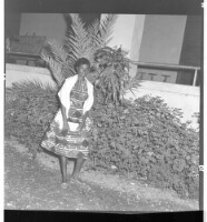 Photo of a group of dancers, one man in a dress shirt and a girl in a dress and hat standing in profile in front of five girls in dresses, all standing in profile, and three men in dress shirts and pants, two playing the drums, and two dancing, all standi