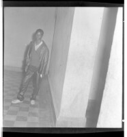 Three men: one in a suit holding a bottle in his hand, the other two in dress shirts and jackets and pants, one wearing a hat, all standing in profile in front of a hallway of a house.