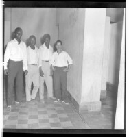 A man in a suit and tie holding the hand of a girl in a dress, both in a dance position standing in profile in front of several others in a room in front of two windows.