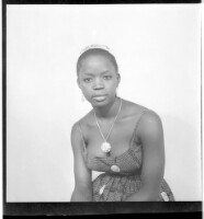 55. EAP449/2/28/55 Reference (shelfmark): EAP449/2/28/55 Title: A girl wearing a dress, head wrap, and necklace sitting face-forward in the studio. Collection Area: Endangered Archives Programme Languages: Not applicable Date Range: 2nd half od the 20th century Extent: 1 TIFF image