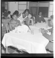 A man in a suit and tie and mask on his head next to a woman in a dress, necklace, and hat, both standing facing forward in front of a crowd in a room.