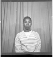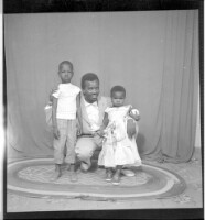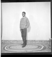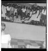 Photo of a dance group with five men in shirts and pants, four dancing, one playing the guitar, all standing in profile accompanied by five girls in dresses, all in dancing positions, three with their back to the camera and two in profile on a stage.