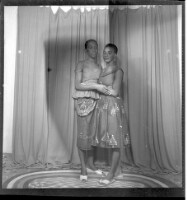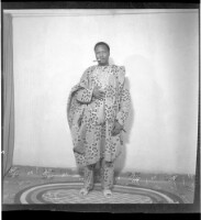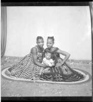 Three people sitting and standing on a mat: one woman wearing a black t-shirt, a skirt, and earrings sitting in a chair with her hair styled holding a little girl who is standing to her right wearing a dress with her hand in her pocket and her hair styled