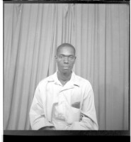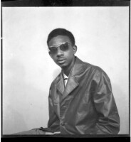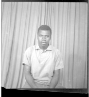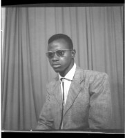 24 young men all wearing white outfits and white head wraps, one also wearing glasses, 14 standing, 7 on their knees, and 3 others standing with a car next to them outside.