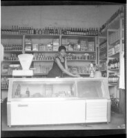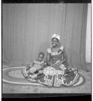 A woman wearing a dress, head wrap, earrings, and bracelets sitting on mat smiling with her arms crossed, with a little girl sitting to her right wearing a dress, a necklace, and earrings with her hair styled, both face-forward in the studio.