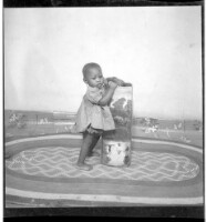 664. EAP449/2/28/664 Reference (shelfmark): EAP449/2/28/664 Title: A little girl wearing a grey camisole standing face-forward on a mat with a flower pot in the studio. Collection Area: Endangered Archives Programme Languages: Not applicable Date Range: 2nd half od the 20th century Extent: 1 TIFF image