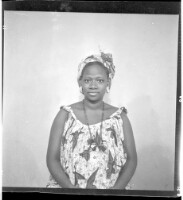 665. EAP449/2/28/665 Reference (shelfmark): EAP449/2/28/665 Title: A woman wearing a camisole, head wrap, necklace, and earrings sitting face-forward in the studio. Collection Area: Endangered Archives Programme Languages: Not applicable Date Range: 2nd half od the 20th century Extent: 1 TIFF image