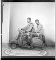 668. EAP449/2/28/668 Reference (shelfmark): EAP449/2/28/668 Title: Two young men sitting in profile on a Vespa on a mat in the studio. Collection Area: Endangered Archives Programme Languages: Not applicable Date Range: 2nd half od the 20th century Extent: 1 TIFF image