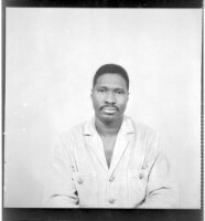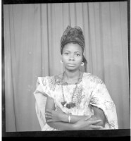 683. EAP449/2/28/683 Reference (shelfmark): EAP449/2/28/683 Title: A woman wearing a pagne and head wrap sitting face-forward in the studio. Collection Area: Endangered Archives Programme Languages: Not applicable Date Range: 2nd half od the 20th century Extent: 1 TIFF image