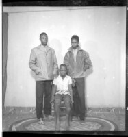 684. EAP449/2/28/684 Reference (shelfmark): EAP449/2/28/684 Title: Two men wearing long-sleeved shirt standing face-forward with their hangs in their pockets and a young man wearing a shirt and shorts sitting face-forward on a chair in the studio. Collection Area: Endangered Archives Programme Languages: Not applicable Date Range: 2nd half od the 20th century Extent: 1 TIFF image