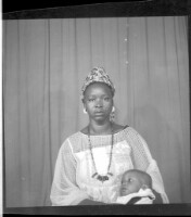 685. EAP449/2/28/685 Reference (shelfmark): EAP449/2/28/685 Title: A woman wearing a pagnes, head wrap, and necklace sitting face-forward and holding a baby in the studio. Collection Area: Endangered Archives Programme Languages: Not applicable Date Range: 2nd half od the 20th century Extent: 1 TIFF image