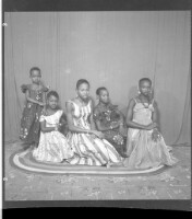 687. EAP449/2/28/687 Reference (shelfmark): EAP449/2/28/687 Title: Five girls wearing dresses, one standing face-forward and four sitting in profile on a mat in the studio. Collection Area: Endangered Archives Programme Languages: Not applicable Date Range: 2nd half od the 20th century Extent: 1 TIFF image
