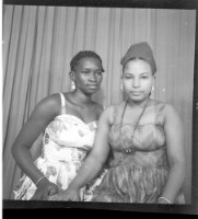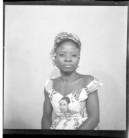 A woman wearing a dress and head wrap sitting face-forward holding a baby on her lap with a little girl wearing a dress and necklace standing face-forward in the studio.