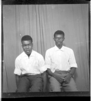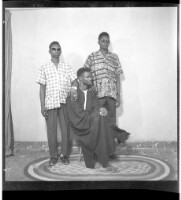 A man wearing a boubou sitting in profile in front of two men wearing shirts, pants, and glasses both standing, one face-forward and the other in profile, in the studio.