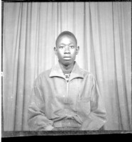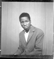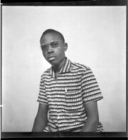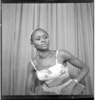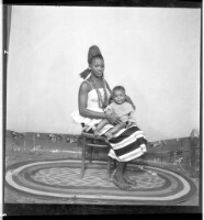 A woman wearing a dress and head wrap sitting face-forward holding a baby on her lap with a little girl wearing a dress and necklace standing face-forward next to her in the studio.