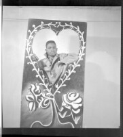 Four men wearing shirts and pants, one wearing a vest and another wearing a hat; one sitting in profile in front of the other three standing in profile in the studio.