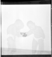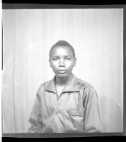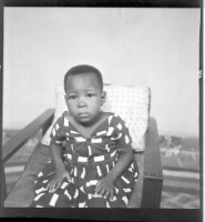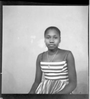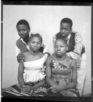 Two girls wearing dresses and pagnes, one sitting face-forward and the other in profile, in front of two men wearing shirts and vests bending over in profile in the studio.