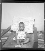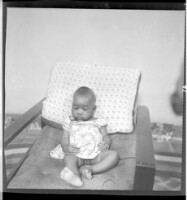 A woman wearing a dress, head wrap, and necklace sitting face-forward with a baby on her lap in between two little girls sitting and three little boys standing in the studio.