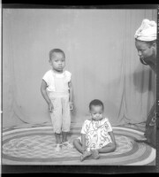 788. EAP449/2/28/788 Reference (shelfmark): EAP449/2/28/788 Title: A woman wearing a dress, head wrap, and necklace sitting in profile next to a little boy wearing a jumpsuit standing in profile in the studio. Collection Area: Endangered Archives Programme Languages: Not applicable Date Range: 2nd half od the 20th century Extent: 1 TIFF image